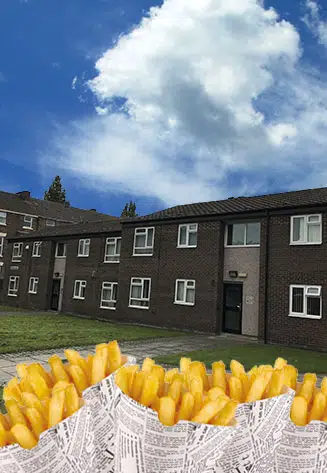 Fore ground chips, background houses and blue sky.